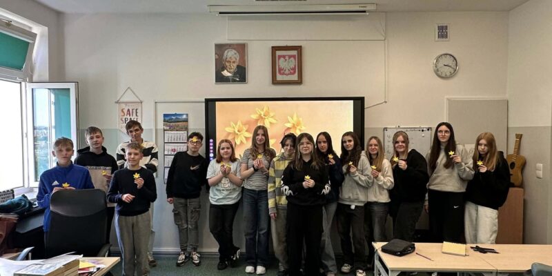 Podczas lekcji języka polskiego uczniowie poznawali losy ludzi żyjących w getcie warszawskim, rozmawiali o odwadze, solidarności i znaczeniu pamięci. Wspólnie przygotowaliśmy papierowe żonkile – symbol akcji – oraz zastanawialiśmy się, dlaczego warto pamiętać o przeszłości.
