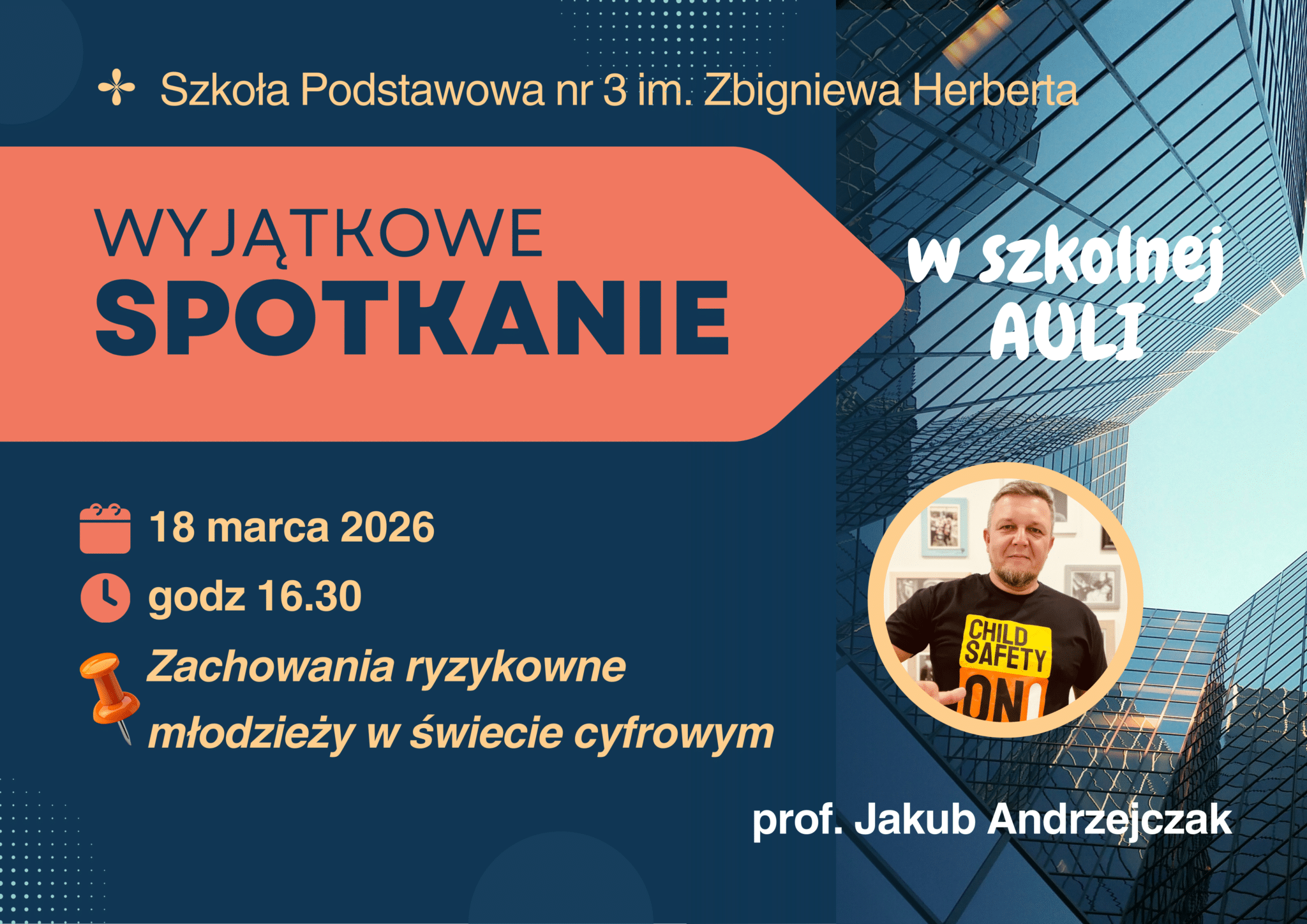 18 marca w szkolnej auli odbyło sie niezwykłe spotkanie, którego tematem były „Zachowania ryzykowne dzieci i młodzieży w świecie cyfrowym”. Profesor Jakub Andrzejczak przez dwie godziny dzielił się swoja wiedzą i doświadczeniem z rodzicami i nauczycielami. Podczas szkolenia prowadzący zwrócił uwagę na wyzwania, przed jakimi stoją współcześni dorośli. Jak podkreślił: „Rodzicielstwo w czasach współczesnych jest o wiele trudniejsze niż dawniej. Rodzice napotykają dziś na problemy, z którymi kiedyś nie musieliśmy się mierzyć.”